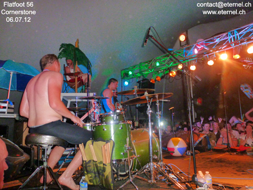 Le soir venu, l’Underground est pleine à craquer pour un concert événement : le dernier show de Flatfoot 56 au Cornerstone. Il faut savoir que le groupe joue au festival tous les ans depuis un petit moment. Et à chaque fois, un thème est choisi pour en faire un moment spécial. Cette année, le thème retenu est « Fête dans une piscine ». Et pour marquer le coup, le groupe a vu les choses en grand en installant un tobogan sur la scène, avec juste ce qu’il faut de savon dessus pour qu’il soit bien glissant. Ce qui donnera pendant le concert quelques mémorables scènes de stage-diving. Plusieurs personnes déguisées font office de maître-nageurs et jettent des bouées et autres accessoires dans la fosse durant le premier titre du concert. Bref, en quelques minutes la salle est transformée en joyeux bazar. Et il faut dire que tout le monde y met du sien. J’avais vu plusieurs fois les Flatfoot lors de tournées en Europe mais les voir chez eux, devant un public déjà conquis, c’est autre chose. Grosse réponse de la part du public donc, sauf sur les nouveaux titres, ce qui est logique puisqu’au moment du Cornerstone le nouvel album n’est pas encore sorti.