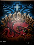 Arrivés assez rapidement sur les lieux, nous découvrons la salle : il s’agit d’un centre pour les jeunes de la ville. Alors que le matériel est installé nous remarquons une superbe peinture sur les murs à l’effigie du label Facedown Records (voir photo). Pas de tête d’affiche ce soir, juste deux groupes locaux. Stay Strong ouvre les hostilités et propose un set sensiblement similaire à celui donné au Freakstock. La plupart des morceaux de la démo y passent. On retrouve un chanteur survolté qui n’arrête pas de bouger, de haranguer la foule, de se frapper la tête avec le micro (eh oui !), de se rouler par-terre, etc. Quelques courageux viennent ventiler dans le pit mais rien de très extraordinaire. Pour un samedi soir on peut dire qu’on a affaire à un public assez endormi. Peut-être manque-t-il une tête d’affiche pour remotiver tout ça ? En même temps, il s’agit d’une soirée de soutien pour une association et les groupe jouent bénévolement. Ceci explique cela. On a droit en rappel au classique "Hate Free Youth" qui semble avoir pas mal de succès ici.